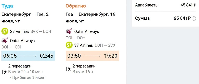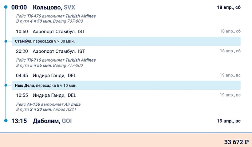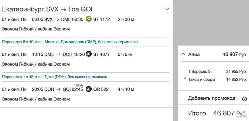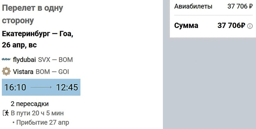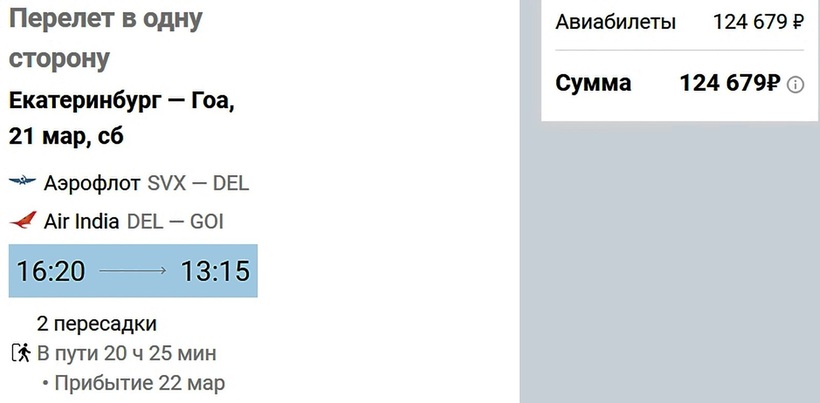 Перелет в индийский штат Гоа — дело долгое — от 20 до 45 часов. Регулярных прямых рейсов из Екатеринбурга (и вообще из России) нет, поэтому лететь приходится с 1–2 пересадками. Интересные варианты предлагают авиакомпании: