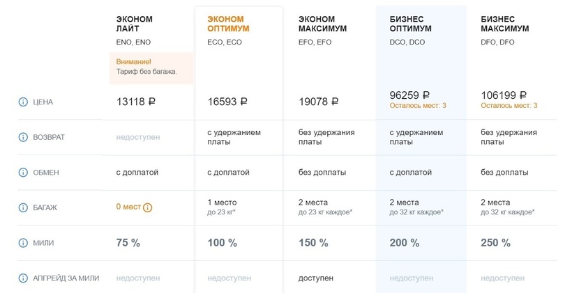 Перевозчик предлагает три тарифа в экономкласс с разным набором опций: