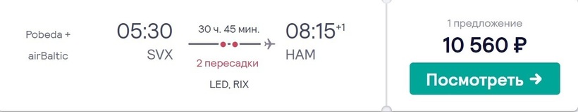 Если привыкли путешествовать с максимальным комфортом, то у «Аэрофлота» есть два тарифа в бизнес-класс. Билеты — от 96300 рублей (за неделю). Обратные обойдутся примерно в такие же деньги. Стыковки всегда происходят в Шереметьево. Кстати, не все знают, что в аэровокзальном комплексе есть бесплатная питьевая вода. Например, в терминале D (собственный терминал «Аэрофлота») фонтанчики с водой можно найти напротив касс 19–21. За тринадцать с половиной часов добраться до Гамбурга можно с «Победой» и «Аэрофлотом». Билеты туда-обратно за 4 месяца до рейса можно купить за 26500 рублей. Стыковка 8 часов в Санкт-Петербурге (аэропорт Пулково). Можете съездить в город, погулять, например, по Невскому проспекту. Дорога туда-обратно на такси займет примерно 1,5 часа. «Победа» и airBaltic предлагают вариант перелета со стоповером в Питере. Общее время в пути — 1 сутки и 7 часов. Стыковка в Санкт-Петербурге — 24 ч. Вторая — в Риге (1 час). Билет — от 10500 рублей (за 4 месяца).
