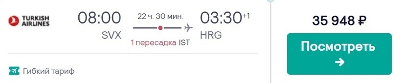 Начну с того, что в популярный египетский город-курорт из Екатеринбурга выполняются только транзитные рейсы. Перелет до Хургады через Стамбул выполняет Turkish Airlines. Стыковка продолжительностью 15 часов позволит устроить мини-экскурсию по городу. Общая продолжительность пути составит почти сутки. Билеты только туда — от 36000 рублей (за 2 месяца). Если купить сразу обратный проездной на рейсы Turkish Airlines, то путешествие будет дешевле на 10%.