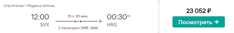 Если не подходят варианты с длительными пересадками, советую путешествовать с двумя стыковками. Так получится попасть в Хургаду быстрее. Например, один из самых оперативных и оптимальных по цене способов добраться до этого египетского города — полететь с «Уральскими авиалиниями» и Pegasus Airlines. Дорога займет 15,5 ч. На стыковки в Москве (Домодедово) и Стамбуле (Сабиха Гекчен) в общей сложности уйдет 7 часов. Обе воздушные гавани большие, современные, с хорошо отлаженной инфраструктурой. Стоимость билетов — от 23000 рублей (за 2,5 месяца).
