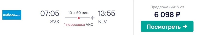 Между Екатеринбургом и Карловыми Варами прямого авиасообщения нет. Лететь придется транзитом (минимум с одной пересадкой). Nordwind Airlines и «Победа» доставят до конечного пункта за 10,5 часов. Стыковка в Москве, и в этом городе требуется смена воздушной гавани. Первый рейс до столицы выполняет Nordwind Airlines, лайнер компании приземлится в Шереметьево. До Карловых Вар полетите с «Победой», вылет из Внуково. Расстояние между аэропортами приличное — 55 километров. Дорога на такси займет 1 час, всего на стыковку отводится 5 часов. По этой причине данный вариант малопопулярный. Стоимость билетов только туда за неделю от 6900 рублей.