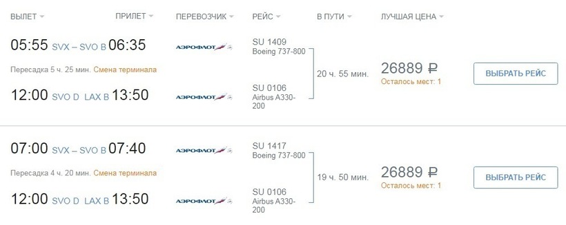 Такую цену можете найти и за несколько дней, и пару месяцев до вылета самолета. Но учтите, что бюджетные тарифы раскупают быстрее всего и лучше забронировать билет хотя бы за пару месяцев до поездки. Обратный авиабилет обойдется примерно в такие же деньги. Теперь о тарифах. В экономклассе их всего три. Все они включают багаж до 23 кг (даже самый дешевый тариф «Бюджет»). Авиапутешествие бизнес-классом обойдется минимум в 132500 рублей (за неделю до вылета). Выгоднее у этой а/к купить билеты сразу туда-обратно, так можно сэкономить примерно 20% от их минимальной стоимости. Я так всегда и делаю, если летаю с «Аэрофлотом» до Лос-Анджелеса. Не всегда удается найти бюджетные авиабилеты с одной пересадкой на нужную дату, тогда летаю с двумя стыковками. Один из самых удобных вариантов в таком случае полететь с «Победой» и «Аэрофлотом» через Питер и Москву. Общее время в пути — 21,5 ч. Первая стыковка в Пулково — 2,5 ч, вторая в Шереметьево — 1,5 ч. Билеты — от 27 тысяч рублей, если бронировать за пару недель.