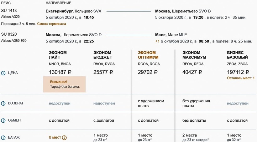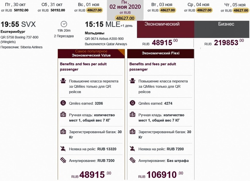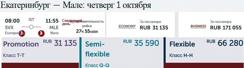 Поскольку между Екатеринбургом и Мале довольно большое расстояние, очень дешевые авиабилеты найти по маршруту не получится. Я для преодоления пути выбрала оптимальный по цене и продолжительности вариант полета — с «Аэрофлотом». Билеты туда-обратно стоили мне дешевле на 3000 ₽, чем у «Турецких авиалиний», и на 28500 ₽, чем у S7 и Qatar. Кроме того, путешествие с российской авиакомпанией занимает на 4,5–15 часов меньше времени, чем с другими операторами. Перелет с «Турецкими авиалиниями» могу рекомендовать тем, кто хочет посмотреть Стамбул. К тому же по стоимости авиабилетов в обе стороны данная компания незначительно уступает российскому перевозчику (на 3000 ₽). Также авиапутешествие с Turkish Airlines подойдет любителям максимального комфорта, потому что этот оператор предлагает самый недорогой полет в бизнес-классе.