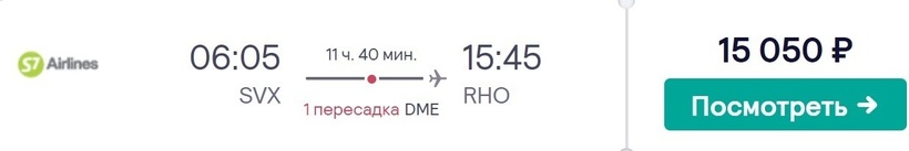 Также отмечу и вполне удобное расписание у S7. Отправление из Екатеринбурга утром. На Родос прибудете после обеда (разница во времени — 2 часа).