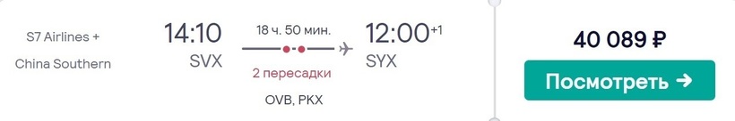 Практически за такие же деньги и время (19 ч.) до места назначения можно добраться с двумя пересадками (перевозчики S7 и China Southern). Билеты обойдутся в 40000 рублей (за 2 месяца).