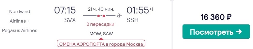 Для полета в этот египетский город я выбрала в качестве авиаоператоров «Уральские авиалинии» и Pegasus Airlines, потому что они предлагают хороший вариант по времени в пути. Плюс стоимость билетов вполне приемлемая. Напомню, что билеты за пять месяцев до вылета можно приобрести за 17200 рублей. Единственный момент — расписание не совсем удобное, потому что прибытие в Шарм-эль-Шейх поздно ночью.