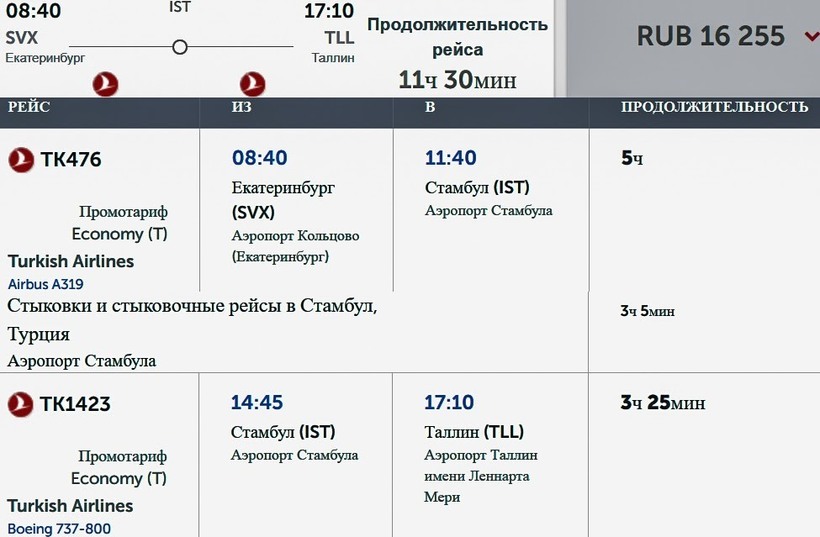 Из Екатеринбурга в эстонскую столицу прямые рейсы не выполняются, но круглогодично можно преодолеть расстояние между городами транзитом. Перелеты с одной стыковкой осуществляют следующие операторы:
