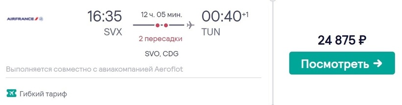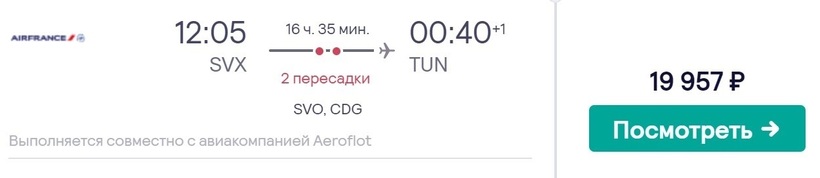 Перелеты до Туниса с двумя стыковками более востребованы, потому что билеты на них гораздо дешевле. Транзитный перелет с «Аэрофлотом» и Air France займет 12 часов. Стыковки — в Москве и Париже. На них в общей сложности уйдет 3 часа. Билеты за пару месяцев до поездки можно приобрести за 24800 рублей. Обе авиакомпании предлагают как эконом, так и бизнес-класс.
