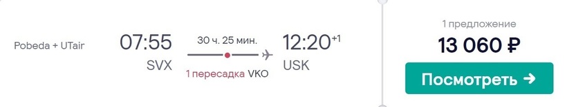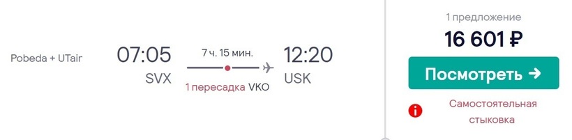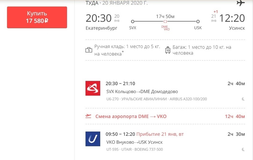Накануне вылета эта цифра может быть выше в 2,5 раза. Так что рекомендую не откладывать покупку проездных на последний день — разница в цене очевидна. «Победа» доставит вас до Москвы — полет продлится 2,5 часа. Лоукостер предлагает только три тарифа в экономкласс, бизнес-класса у него нет. Самый дешевый тариф у перевозчика — «Базовый». В стоимость билета включен перелет и ручная кладь (по весу она не ограничивается, но суммарные габариты должны быть не более 36х30х27 см). Стыковка происходит во Внуково. На нее дается 2 часа с небольшим. Перевозчики не имеют между собой соглашение о пересадке, и вам нужно будет забрать багаж и зарегистрироваться на следующий рейс до Усинска. Дальше полетите с «ЮТэйр». Перелет до Усинска продлится также 2,5 ч. А/к предлагает три тарифа в эконом. Самый бюджетный — «Минимум». Он также, как и у «Победы», только с ручной кладью. Единственное — перевозчик ограничивает ее вес до 5 килограммов. Еще у этих а/к возможен перелет со стоповером в Москве. Такой рейс обойдется дешевле. Авиабилеты — от 13000 рублей (за два месяца).