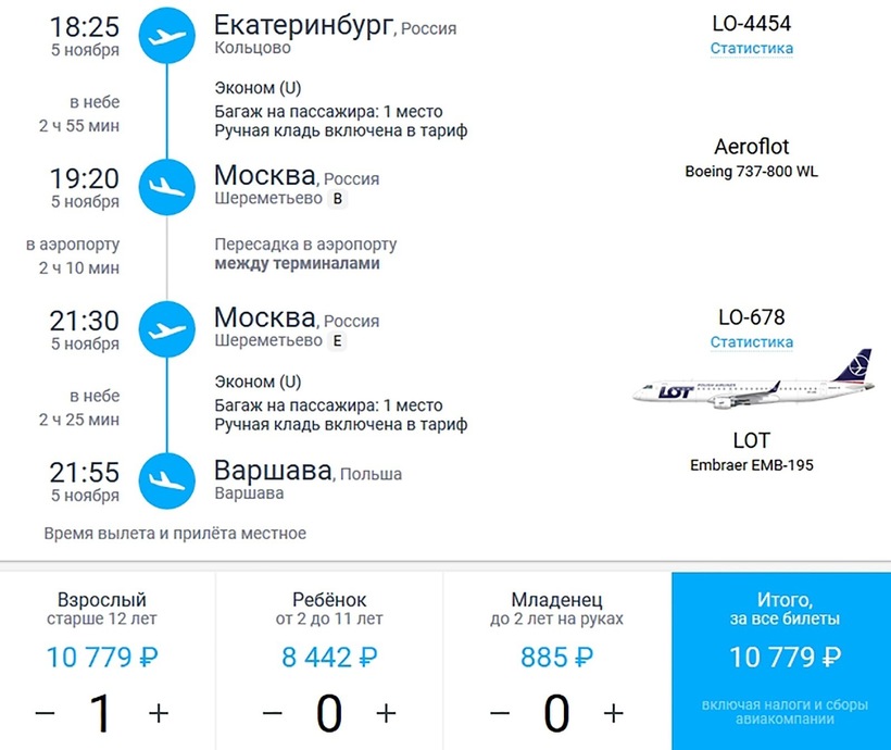 «Аэрофлот» и LOT — совместный полет с одной пересадкой (в Шереметьево). Он выполняется ежедневно, есть вылеты утром и вечером. Самый короткий перелет занимает 7,5 часа (со стыковкой около 2 часов). Посадка в аэропорту имени Шопена. На ближайшие даты билеты только туда доступны от 10700 ₽.