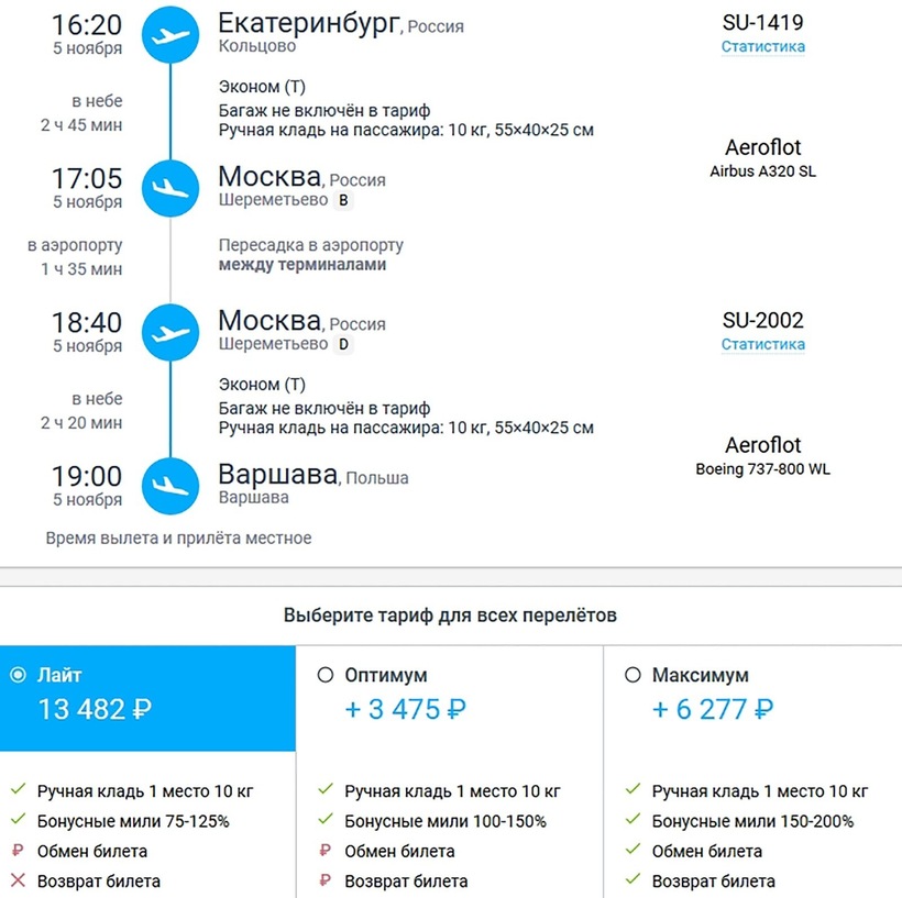13500 ₽ — по тарифу «Эконом Лайт» с ручной кладью 10 кг;