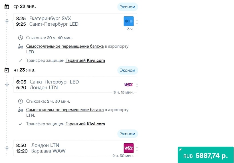 Если лететь с двумя пересадками, без вещей и с бюджетной авиакомпанией, то можно сэкономить. Но такие путешествия удобными не назовешь. Скажем, если лететь с «Победой» и Belavia, вам придется провести в Москве 12 часов (да еще и аэропорт сменить с Внуково на Жуковский), а в Минске (место второй стыковки) — еще 17 часов. При полете с «Победой» и Wizz Air через Санкт-Петербург (пересадка 20 часов) и Лондон (пересадка в Лутоне) по цене 5900 ₽, вам понадобится британская виза (одной шенгенской недостаточно). И не имеет значения, что вы не будете покидать аэропорт — в Лутоне нет транзитной зоны.