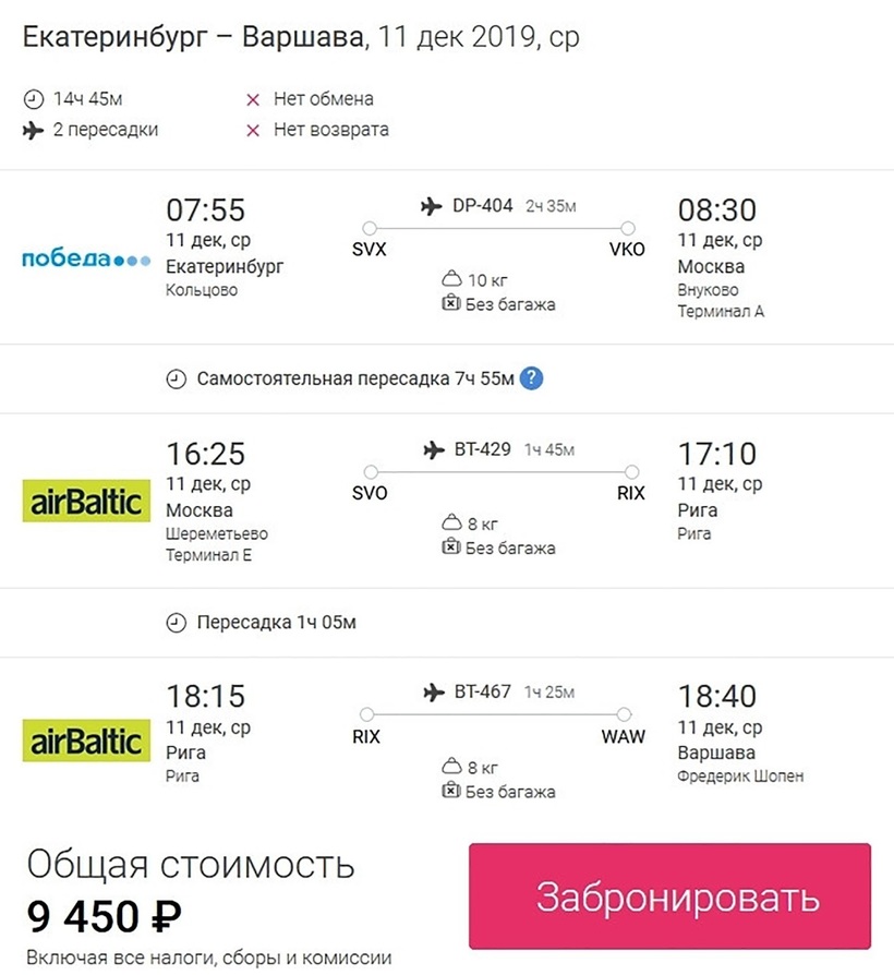 Наиболее приемлемый вариант — комбинация рейсов «Победы» и airBaltic. Пересадки совершаются в Москве (с переездом из Внуково в Шереметьево) и Риге. В Москве пассажир проводит 8 часов, а в Риге — 1 час. Цена такого авиапутешествия где-то 8–9 тысяч ₽.