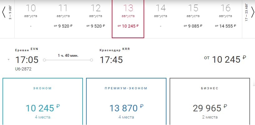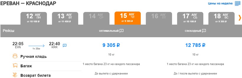 Билеты «туда-обратно» в ноябре обойдутся вам всего в 12 392 рубля, а в июле придется заплатить за них не менее 18 702 рубля. В среднем же, долететь до Краснодара и вернуться в Ереван можно за 15 805 рублей.
