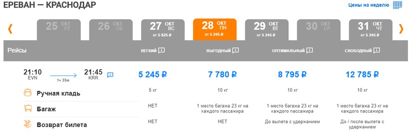 «Выгодный» — на борт авиалайнера можно взять ручную кладь до 10 кг и до 23 кг багажа, сдать при необходимости авиабилеты нельзя.