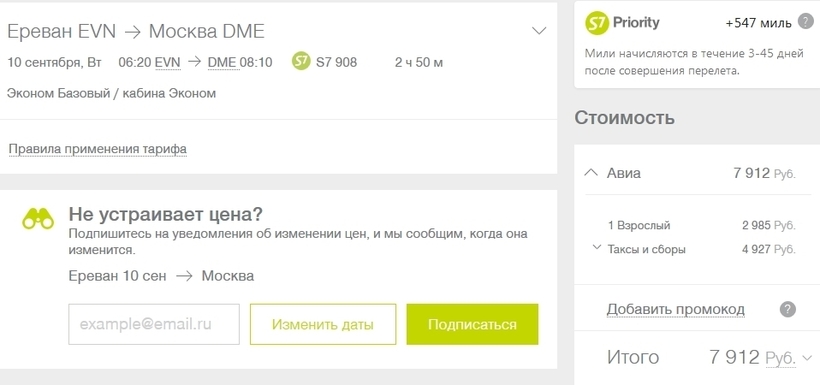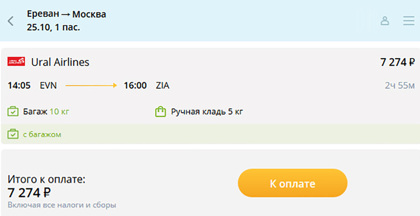 «Аэрофлот» — самая мощная авиакомпания России летает из Еревана 6 раз в день. За 1,5 месяца до вылета можно купить авиабилет на обратный перелет в столицу примерно за 9,5 тысяч. В минимальный тариф включена только кладь — 10 кг. Прибавьте 2 тысячи и можете везти еще 23 кг.