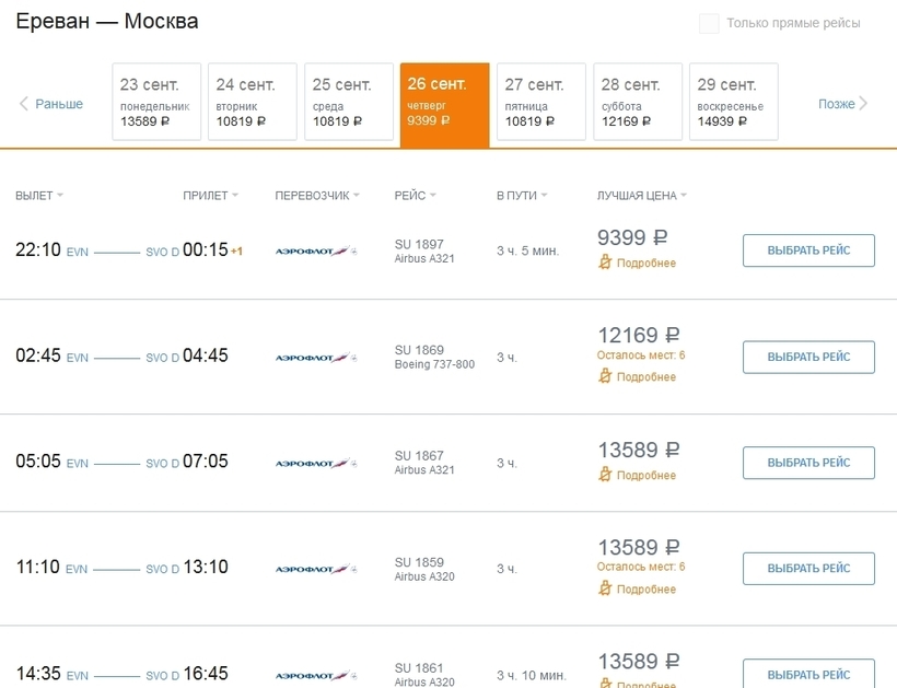 | Аэрофлот (SU 1865) Airbus A320 | 14:25 Ереван (EVN) | 3 ч. 30 мин | 16:55 Москва (SVO) | 26, 27, 28, 29, 30, 31 октября, 3, 4, 5, 6, 7, 8, 9, 10, 11, 12, 13, 14, 15, 16 ноября, … |