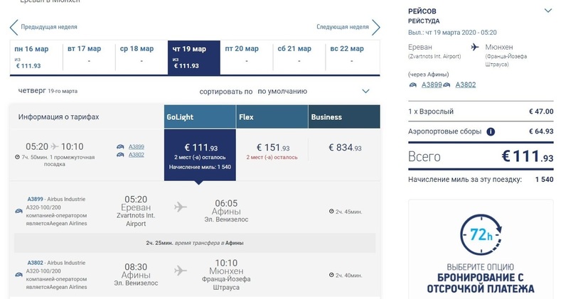 Aegean. У этой авиакомпании есть единственный утренний рейс из Еревана с пересадкой в Афинах, ее длительность может отличаться. Наиболее быстрый вариант предполагает около 2 часов в Афинах, суммарное время полета до Мюнхена составит 7,5 часа. Стоимость билета эконом-класса составляет от 9900 рублей (наиболее дешевый тариф GoLight). Стоимость авиабилета включает ручную кладь весом до 8 кг, потому данный тариф подойдет тем, кто путешествует налегке. Вариант с 9-часовой пересадкой позволит насладиться панорамой Афин с Парфенона, побродить по Плаке. Можно заглянуть на площадь Синтагма. Еще один рейс предполагает 6-часовую остановку и полет от Афин самолетом немецкой Lufthansa, в эконом-классе доступен лишь тариф Flex, стоимость — от 34000 рублей. Приведенная стоимость авиабилетов актуальна за месяц до вылета или с большей отсрочкой. Летом/зимой время вылета почти неизменно. Если купить авиабилет примерно за 7 месяцев перед вылетом, то скидка составит приблизительно 1500 рублей. За год вперед компания билеты не продает.