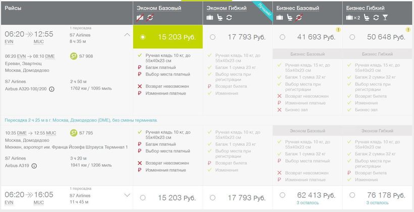 S7. Российская авиакомпания предлагает полет через Домодедово. Ежедневно из Еревана летит 1–2 рейса, второй предполагает провести до 10 часов в аэропорту. Обычно самолет вылетает из Домодедово утром и летит до Мюнхена приблизительно 3,5 часа. Билет стоит около 15200 рублей (тариф «Эконом Базовый», билеты по этой стоимости можно приобрести за месяц до перелета), зато ручная кладь ограничена весом в 10 кг. Если длительная пересадка предполагается днем, стоит погулять по столице. Кроме посещения Красной площади и расположенных рядом ГУМа, мавзолея и Собора Василия Блаженного, рекомендую посетить Манежную площадь. При заблаговременной покупке билетов скидок почти нет (выгадать можно не более 150 рублей). К дополнительным плюсам в пользу S7 отнесу возможность оплатить перелет накопленными за предыдущие полеты милями. Впрочем, есть такая возможность и у других авиакомпаний.