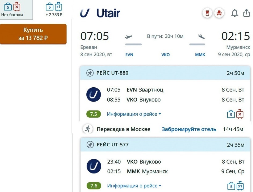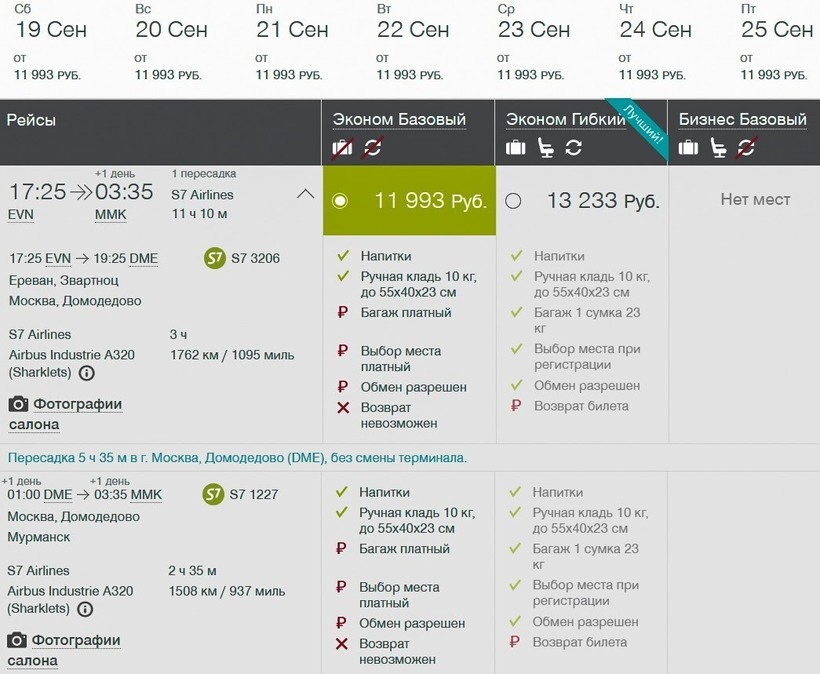 Компания S7 незначительно, но уступает вышеописанному авиаперевозчику по графику полетов: в весенне-летнее время самолеты летают каждый день по два раза, в ноябре–марте S7 выполняет по одному ежедневному авиарейсу. Включая пересадку в московском Домодедово продолжительностью 5–9 часов, путешествие занимает 11–14,5 ч. Стыковка дневная, поэтому вместо длительного ожидания в аэропорту советую прогуляться по российской столице и взглянуть, например, на Кремль, Большой театр, храм Василия Блаженного, Останкинскую телебашню и прочие достопримечательности. Полет по маршруту с S7 могу рекомендовать потому, что у данного перевозчика есть существенное преимущество перед «Аэрофлотом» по стоимости авиабилетов: туда с багажом можно купить примерно за 13500 ₽, если забронировать места и на обратный путь, это обойдется от 20500 ₽. Авиаперелет по тарифу с ручной кладью дешевле всего на 1500 ₽ в одну сторону. Бизнес-класс доступен только из Еревана до Москвы, из российской столицы до Мурманска S7 предлагает авиаперелет лишь в классе эконом. Такое путешествие обойдется от 41500 ₽.