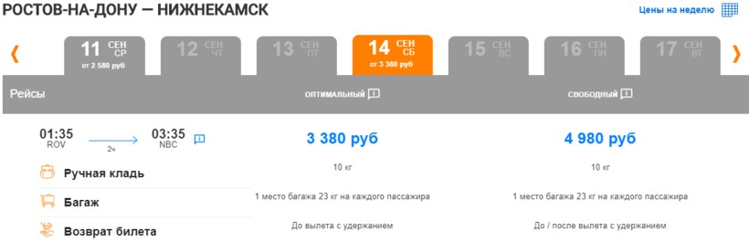 Самым большим минусом перелета с данным оператором могу назвать самостоятельную стыковку в Ростове. Это означает, что вам нужно будет купить два авиабилета и заново пройти регистрацию, сдать багаж, если таковой имеется. Компенсируется данное неудобство низкой ценой перелета. Проанализировав цены авиакомпании на несколько месяцев вперед, отмечу, что куда выгоднее брать билеты заранее. Если покупать их за пару дней до вылета, то суммарная цена перелета составит минимум 12–15 тысяч рублей. До 26 октября 2019 г. у компании есть вечерний вылет до Ростова три раза в неделю. Самолет в Нижнекамск вылетает через 1 час 40 минут, суммарное время полета составит 5 часов.