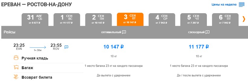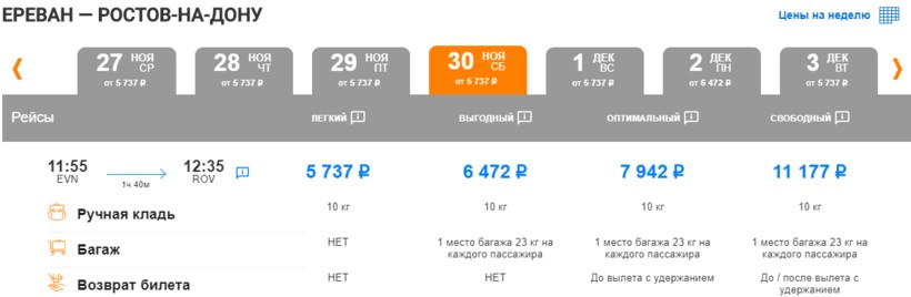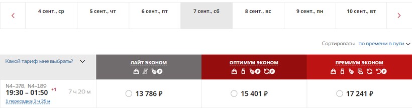 Это самая дешевая цена на перелет, с собой можно взять только ручную кладь. Всего же оператор предлагает 3 тарифа в экономкласс: