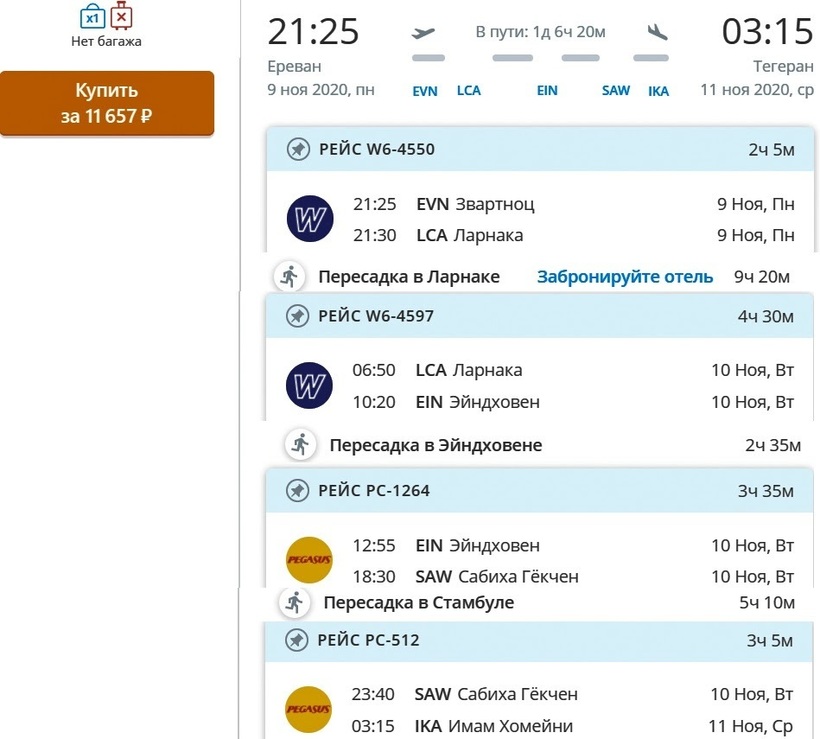 Туристам, для которых важна стоимость авиапутешествия, а не время в пути, могу рекомендовать полет рейсами с тремя самостоятельными пересадками. Например, с лоукостерами Wizz Air и Pegasus можно преодолеть маршрут за 30,5 ч. (включая стыковки в Ларнаке в 9,5 ч., Эйндховене в 2,5 ч. и Стамбуле в 5 ч.). Преимуществом этого варианта перелета являются дешевые билеты — с ручной кладью стоят от 11500 ₽. Из минусов (кроме длительности полета) следует отметить необходимость оформления шенгенской визы.