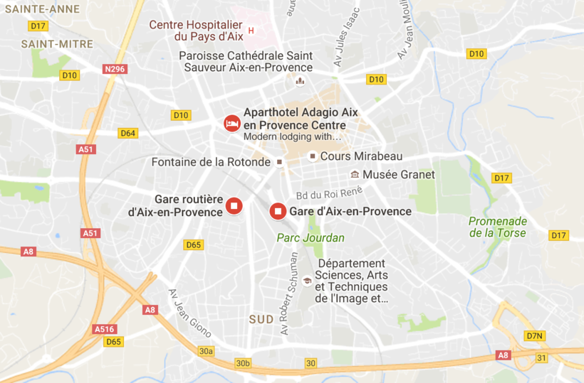 Будьте внимательны: региональные поезда прибывают в центр Экс-ан-Прованса, а вот вокзал, осуществляющий международные маршруты, находится аж в 15 км от центра города! Оттуда до центра города можно добраться за 15-20 минут на шаттл-басах, которые ходят также часто – каждые 20-30 минут – и прибывают на автовокзал Aix Bus Station (5 минут пешком от центра города).