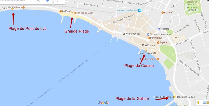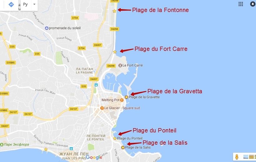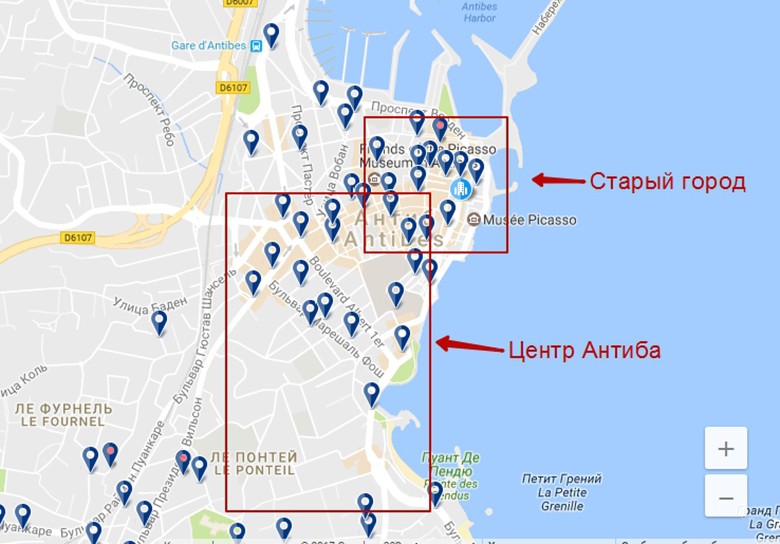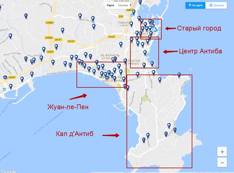 Антиб – крупный город по меркам Лазурного берега, он состоит из множества районов. Если вы приехали на отдых, для вас будут интересны следующие места проживания, которые я отметила на карте.