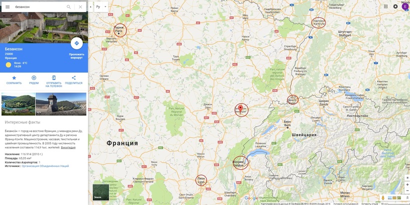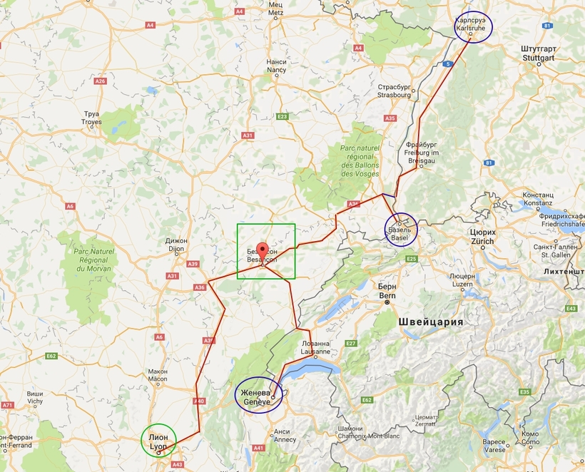 Как видите, город Безансон находится почти на самой границе со Швейцарией. В самом низу карты – Лион, чуть правее – Женева. Над ней расположен Безансон, справа от которого – Базель. На самом верху карты слева вы увидите Париж, а справа – Карлсруэ. Города, отмеченные красным – пункты, из которых можно добраться до Безансона.