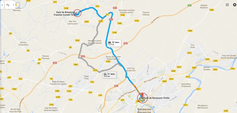 Добраться поездом до Безансона из самой Франции не составляет больших проблем. Однако если вы решите прилететь в аэропорты соседних стран, то возникнут некоторые проблемы, связанные с большим числом пересадок. Поэтому опишу для вас два самых удобных и красивых пути в Безансон на поезде: дорога из Лиона и путешествие из Женевы.