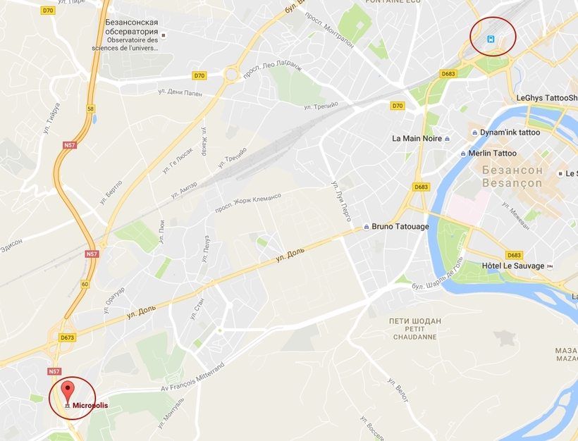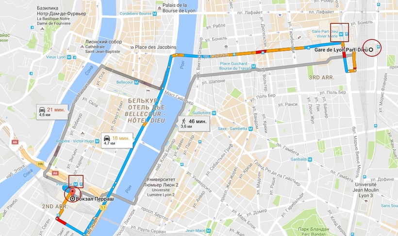 Дешевле до Безансона можно добраться на автобусе OUIBUS (9 EUR, идет 3 часа 20 минут). Из аэропорта Лиона на поезде или трамвае вы прибываете на вокзал Lyon-Part-Dieu, который отмечен красным кружком вверху карты. Автобусы же отходят с вокзала Perrashe (местные железные дороги), отмеченного красным кругом внизу карты. Добраться можно тремя способами. На такси, что выйдет приблизительно в 10-15 EUR. Пешком, если вам некуда спешить. Поверьте, Лион стоит того, чтобы пройтись по его набережной. И на метро, станции отмечены красными квадратами. Одноразовый билет стоит 1,8 EUR.