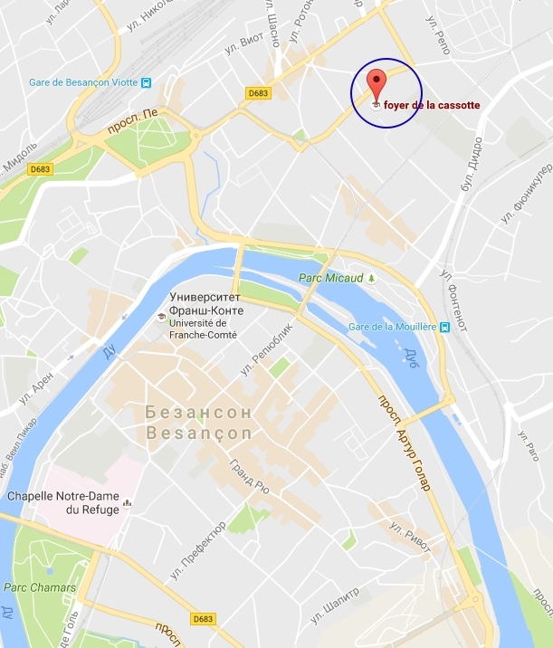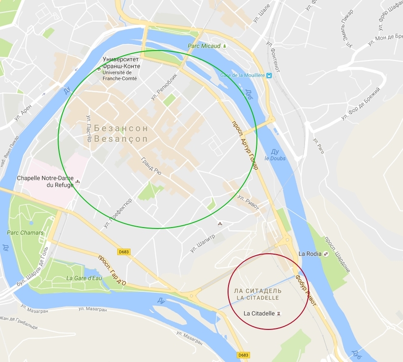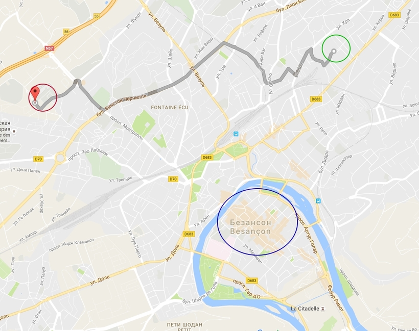 От Besançon-Viotte, чтобы добраться до центра города, нужно пройти по подземному переходу у памятника, полюбоваться парком, а затем перейти реку Ду по симпатичному мосту, и вы в центре.