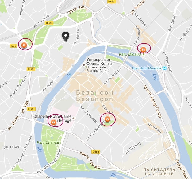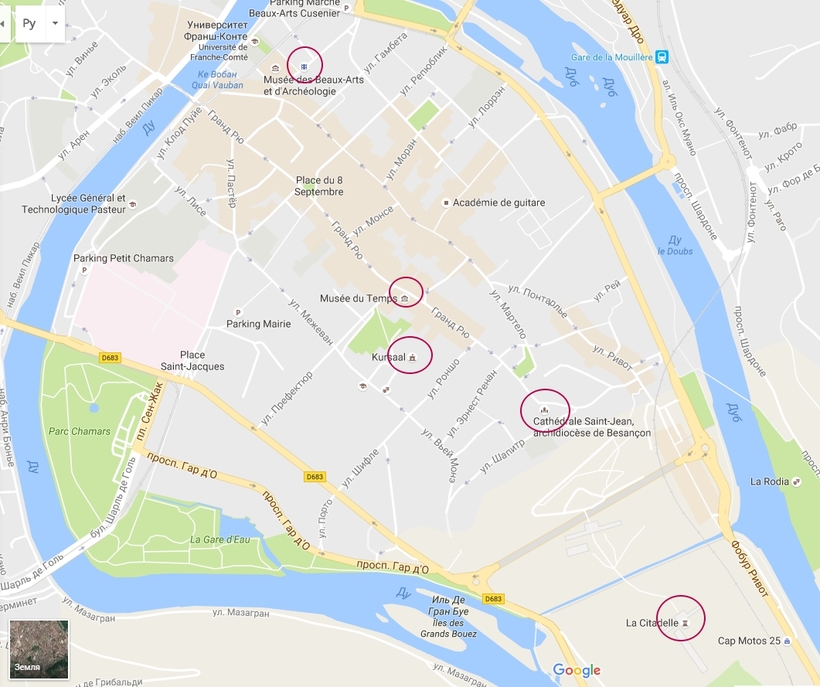 На карте ниже красными кружочками отмечены основные музеи Безансона: