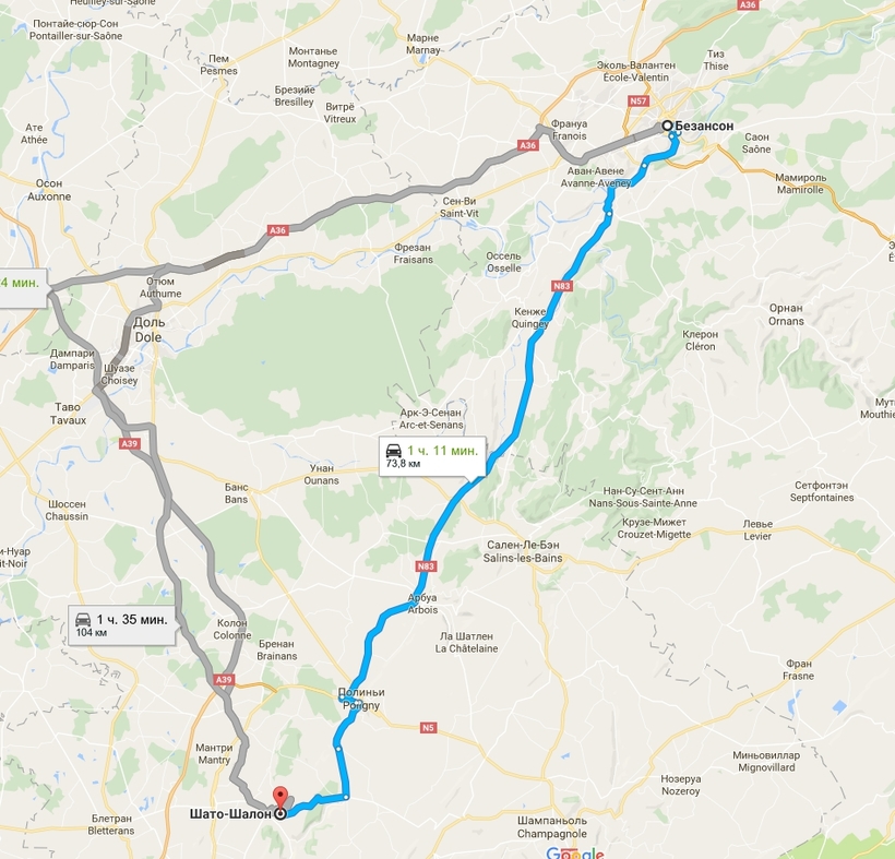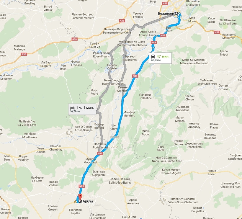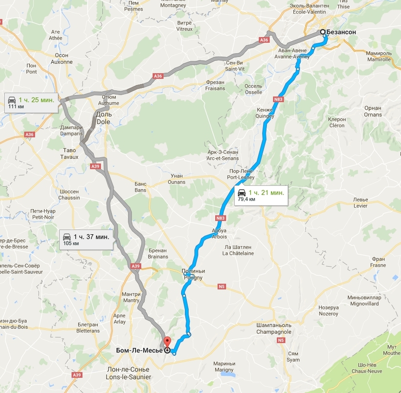 - Из Международного аэропорта Лиона имени Сент-Экзюпери до Безансона доберетесь на машине за 2 часа 30 минут, учитывая пробки, которые во Франции не редкость. Из аэропорта следуете по А432, затем выезжаете на А42 в сторону Pont-d'Ain, после него на А40 в сторону Saint-Lothain, после La Charme выезжаете на А391 и N83, по которой и доезжаете до Grande Rue Besancon.