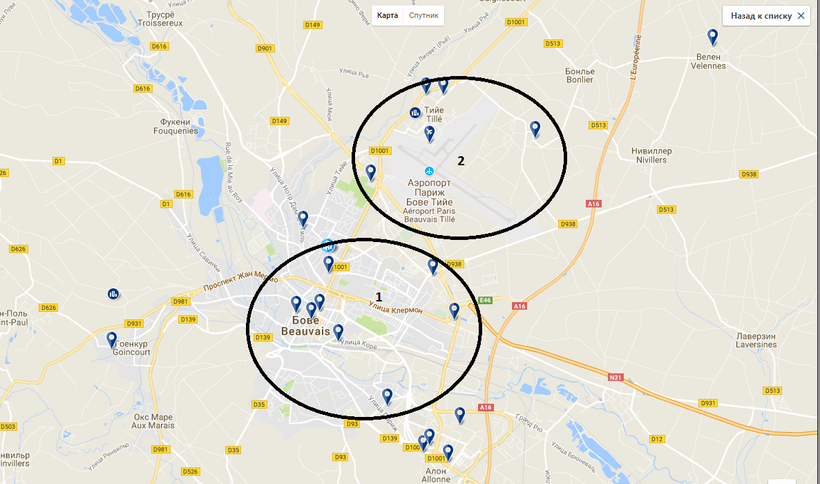 Все основные достопримечательности в Бове сосредоточены в центральном районе, поэтому я бы посоветовала остановиться здесь (на карте район отмечен под цифрой один). Кроме того, именно в центре расположена железнодорожная станция, от которой идут электрички в сторону Парижа. Но в центре города жилье будет немного дороже.