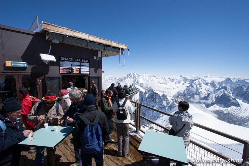 На «Полуденном пике» (именно так называется это место, если перевести с французского) есть чем заняться и помимо созерцания небесных пейзажей. Здесь располагается панорамный снек-бар «3842», интерактивный музей альпинизма, а также нечто вроде стеклянной будки. Когда заходишь сюда, создается впечатление, что паришь над землей, ведь и стенки и пол этой «будки» абсолютно прозрачные. Незабываемое ощущение. Называется этот аттракцион Le Pas dans le vide («Шаг в пустоту»).