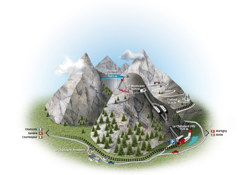 В Chatelard вас будет ждать подъемник. Поднявшись на гору, пересаживайтесь на маленький панорамный поезд, из окна которого вы сможете наблюдать чарующие пейзажи гор и лесов. Поезд подвезет вас к еще одному подъемнику (Mini Funic), который за считанные минуты поднимет вас до водохранилища. Кстати, здесь даже есть кафе.