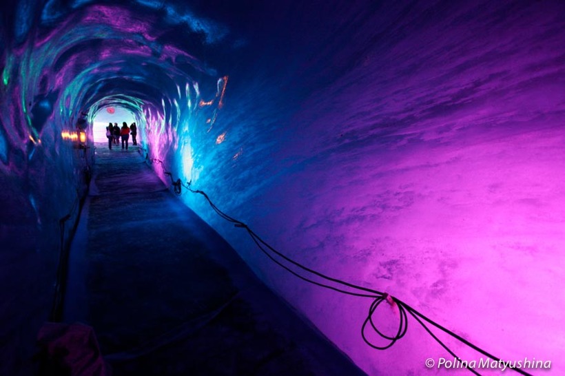 Про экскурсию по гроту надо сказать отдельно. Это искусственно вырубленная ниша, ведущая в центр ледника. Стены грота подсвечиваются разными цветами, что создает ощущение настоящей зимней сказки. Кроме того, здесь выставлены различные экспонаты, связанные с жизнью альпийский горцев в XIX веке (сани, лыжи, разнообразная утварь). Место действительно уникальное. Чтобы поддерживать пещеры в безопасном состоянии, местные инженеры постоянно что-то корректируют. Ведь ледник движется, а с ним изменяется и форма туннеля.