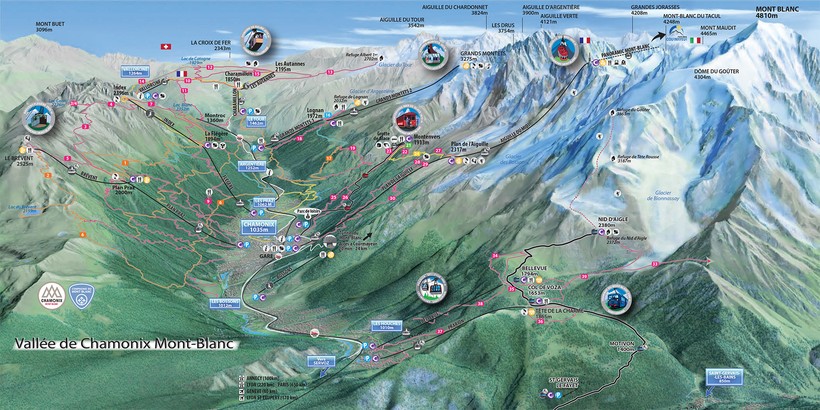Всего по долине курсирует восемнадцать маршрутов. Линии №1 и №2 отправляются от Chamonix Sud, делают небольшой круг по городу, а затем проезжают 4 основных деревни — Les Houches, Servoz, Argentiere и Vallorcine. Расписание остальных автобусов можно узнать здесь.