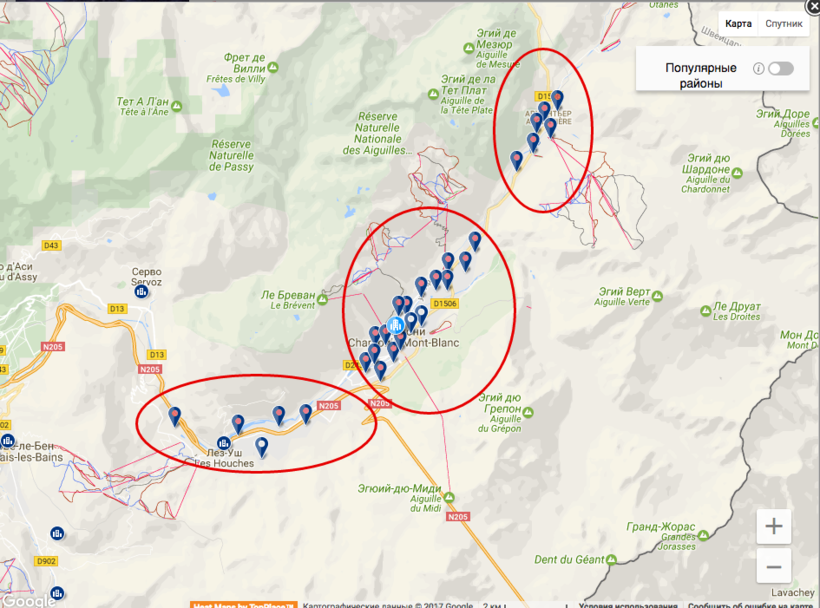 Шамони — маленький благополучный городок, живущий в основном за счет туризма. Он не делится на районы. Но слово «Шамони» означает не только городок, но и коммуну, которая включает в себя 16 деревушек (villages) и поселений (hameux) в долине у подножья гор. Подавляющая часть жилья находится собственно в Chamonix, а также в Les Houches и Argentière (я в свое время остановилась именно здесь).