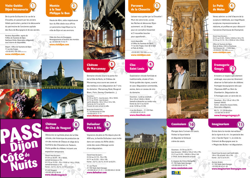 Если хотите бесплатно пользоваться общественным транспортом, скидками в некоторых бутиках, а также попасть на винные дегустации, покупайте там же Pass Dijon Côte de Nuits (на 24 часа стоит 18 EUR, на 72 часа — 45 EUR).