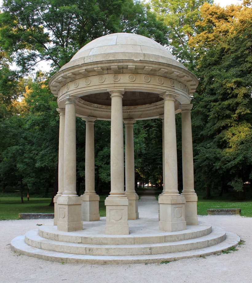 - Парк «Коломбьер» (Parc de la Colombiere). Парк площадью 30 гектаров в южной части города. Я дошла до него пешком по широким тенистым аллеям от площади Уилсона (Place Wilson). Можно доехать и на бесплатном туристическом автобусе Diviacity. В центре парка оставили нетронутыми остатки древней римской дороги и «Храм любви» (на фото). В парке произрастает более 6 тысяч растений, а в вольерах разгуливают ослики, страусы, необычные нашему глазу курицы и иная живность.