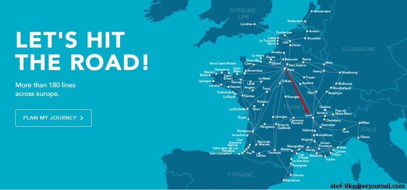 Как пример, Париж – Лион. Длительность поездки от 5 ч 55 минут до 7 часов 45 минут. Цена почти всегда стандартная – 15 или 19 EUR.