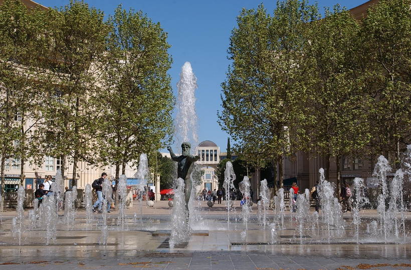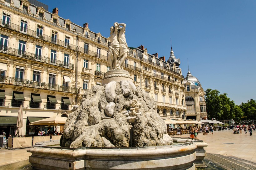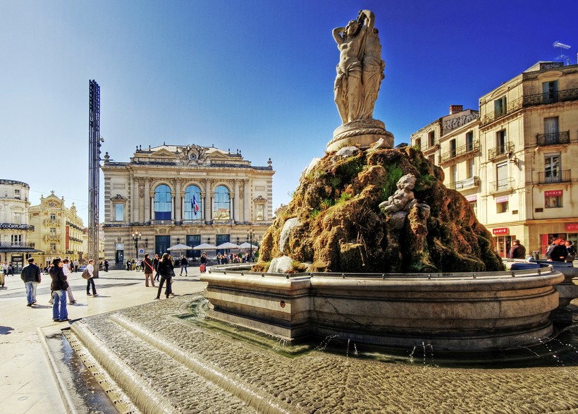 - Place de la Comedie или площадь Комедии. Центральная городская площадь, оказавшись на которой, особенно в яркую солнечную погоду, перемещаешься на пару минут в диснеевскую сказку, настолько все вокруг красочное и блестящее. Я про себя называю ее «золотая площадь» за богатую лепнину исторических зданий и общее впечатление ленной роскоши. У фонтана Трех Граций обязательно наигрывают какие-нибудь мелодии местные трубадуры, народ сидит в кафе, гуляет по парку де Голля или просто глазеет по сторонам. Жизнь бьет ключом!