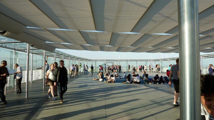 С площадки поднимитесь на террасу 59 этажа. Правда, возможно это только по лестнице с 56 этажа.