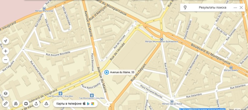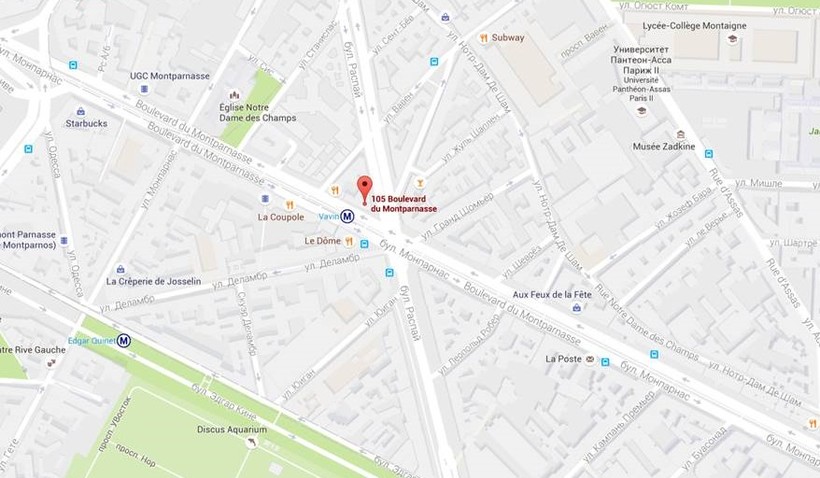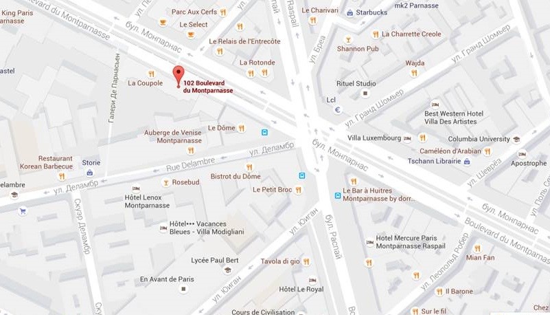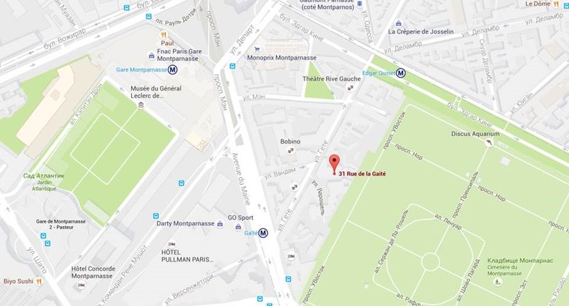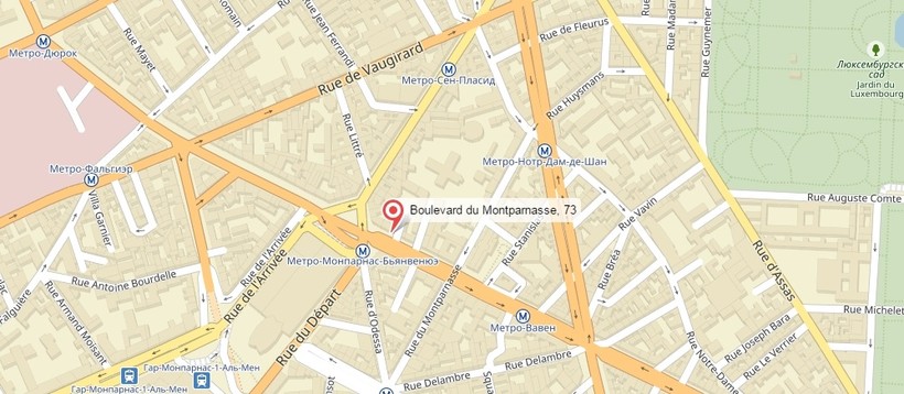 - Метро: станция Montparnasse-Bienvenüe (Монпарнас-Бьянвеню) – 4, 6, 12 или 13 линии.