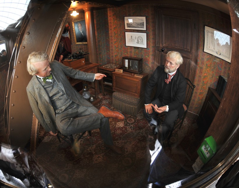 В этом своем жилище на седьмом небе Эйфель в 1899 году принимал знаменитого американского изобретателя Томаса Эдисона. Говорят, их встреча– с кофе, коньяком и сигарами – длилась десять часов. А я вот своими глазами видел: они сидят там, на самой верхушке башни, до сих пор! И служанка в сторонке замерла в ожидании: чего еще изволят господа инженеры? Но инженеры тоже застыли в своем вековом разговоре. Да уж не восковые ли они?
