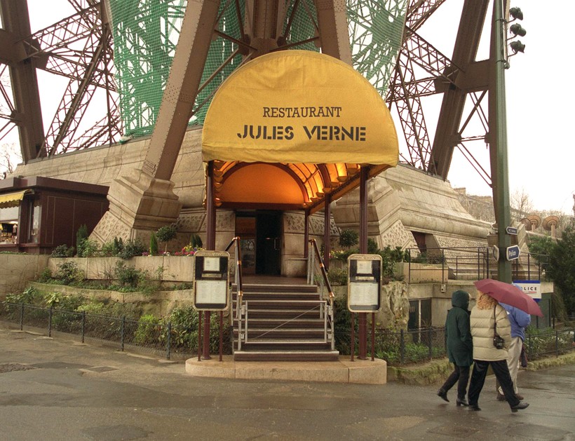 Здесь, помимо прекрасного обзора Парижа, вам предложат отобедать или отужинать в ресторане «Жюль Верн» (вход в лифт, который домчит вас лично до него, на снимке). Великий фантаст и выдумщик, предсказавший многие привычные сейчас изобретения, увековечен точкой общепита на высоте 115 метров. Цены тут, правда, тоже фантастические: раза в два выше, чем этажом ниже. Дорого? И на первом, и на втором этажах есть буфеты с «домашними сандвичами», выпечкой и напитками – горячими и холодными.